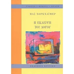 “Η έκλειψη του λόγου” είναι το πρώτο βιβλίο που εκδώσαμε, το 1987. Η εκ νέου κυκλοφορία του με καινούργιο εξώφυλλο και σε περιορισμένο αριθμό αντιτύπων κρίθηκε σκόπιμη, μετά από 17 χρόνια, γιατί η οξυδερκής σκέψη και επιχειρηματολογία του μεγάλου γερμανού φιλόσοφου του 20ού αιώνα δεν έχει χάσει τίποτα από τη λάμψη της. Αντίθετα μάλιστα, οι επισημάνσεις του Χορκχάιμερ για τα κοινωνικά ήθη και τις αξίες της εποχής μας, όπως και για το ρόλο της μαζικής κουλτούρας και των ΜΜΕ δείχνουν στις μέρες μας να επιβεβαιώνονται με τον πιο περίτρανο τρόπο.